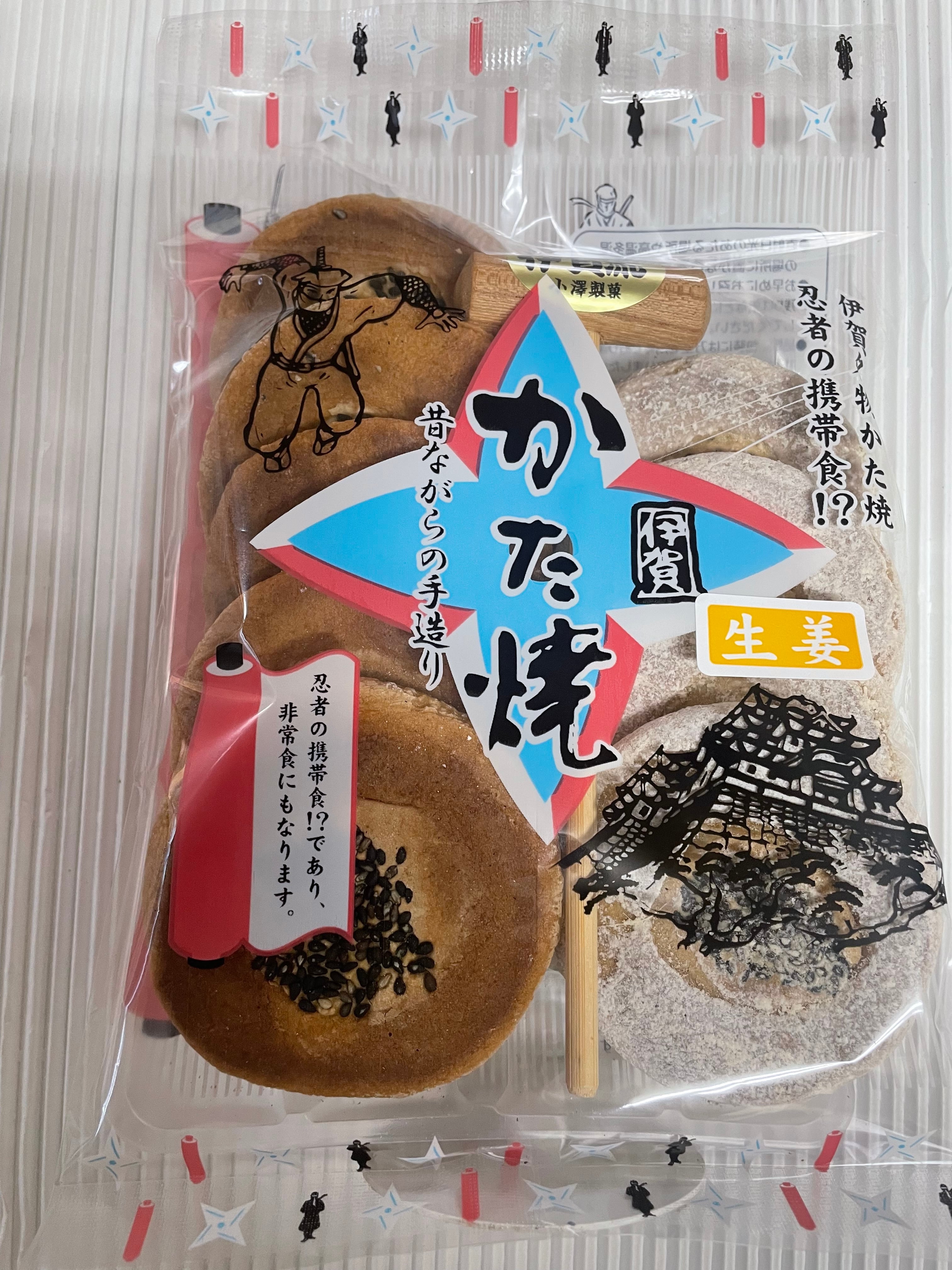 伊賀名物かた焼きプレーンと生姜砂糖をまぶしたかた焼きの詰め合わせになります。 プレーン5枚、生姜砂糖味4枚、木づち付きになります。