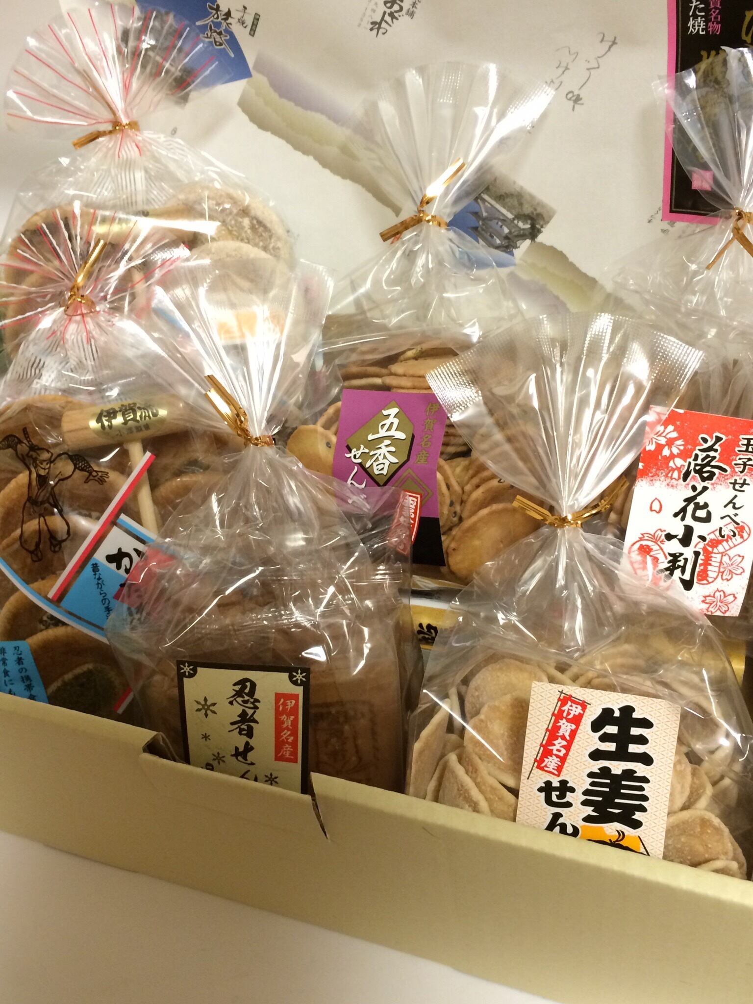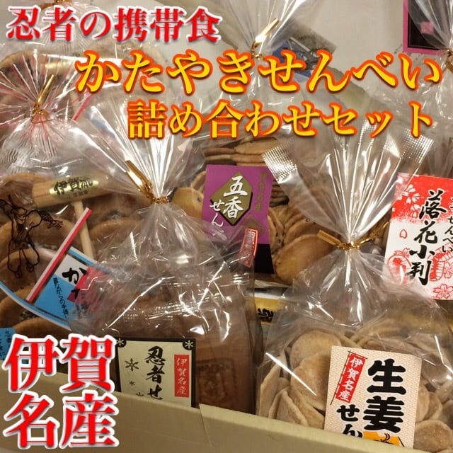 かた焼き9枚入り、かた焼きmix9枚入り、生姜せんべい120g、五香せんべい120g、落花せんべい16枚、忍者せんべい14枚